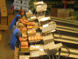 In einer neuen, modernen, im Jahre 2000 erbauten Sortier- und Packstelle werden die produzierten Eier aus